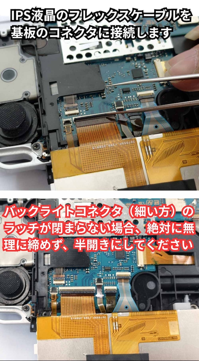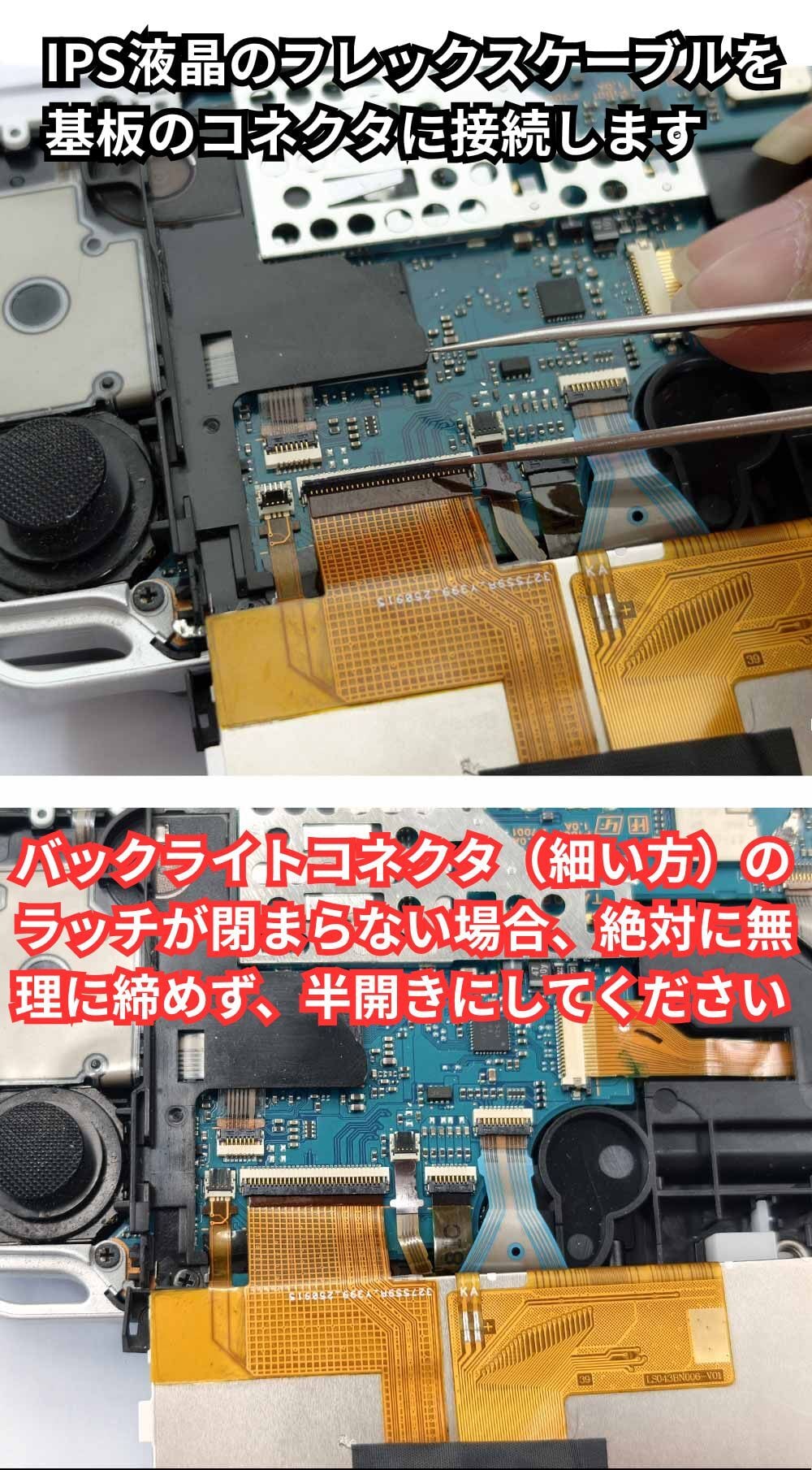 ・バックライト側のフレキシブルケーブル(細い方)は厚みがあるため、基板側のノッチ(ラッチ)を完全に閉め切ると、コネクタが破損する恐れがあります。ノッチは必ず半開きの状態で固定してください(半開きでも通電、固定に問題はありません)。